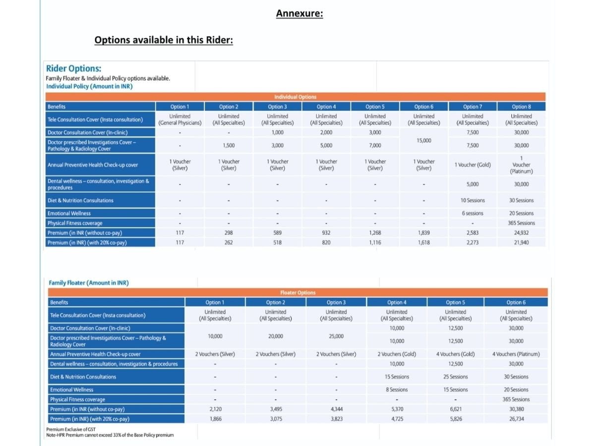 • The enhanced rider provides new coverages namely – Emotional Well-being, Dental Wellness, Diet and Nutrition Consultations, and Physical Fitness Cover – in addition to Tele-consultation Cover, Doctor Consultation Cover, Investigations Cover, and Annual Preventive Health Check-up Cover