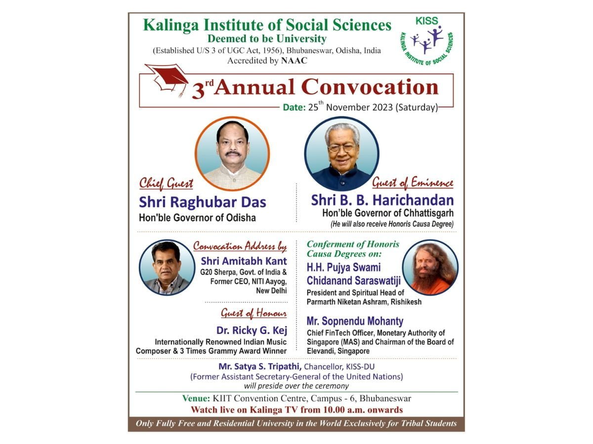 The Third Convocation of KISS Deemed to be University is being held on 25th November 2023. It is a matter of great honour that Shri Raghubar Das, Hon’ble Governor of Odisha, will be the Chief Guest, while Shri Biswabhusan Harichandan, Hon’ble Governor of Chhattisgarh, will grace the occasion as the Guest of Eminence. Shri Amitabh Kant, G20 Sherpa, Govt. of India and Former CEO, NITI Aayog will deliver the Convocation Address, and Dr. Ricky G. Kej, Internationally Renowned Indian Music Composer & Three-time Grammy Award Winner will adorn the event as the Guest of Honour.