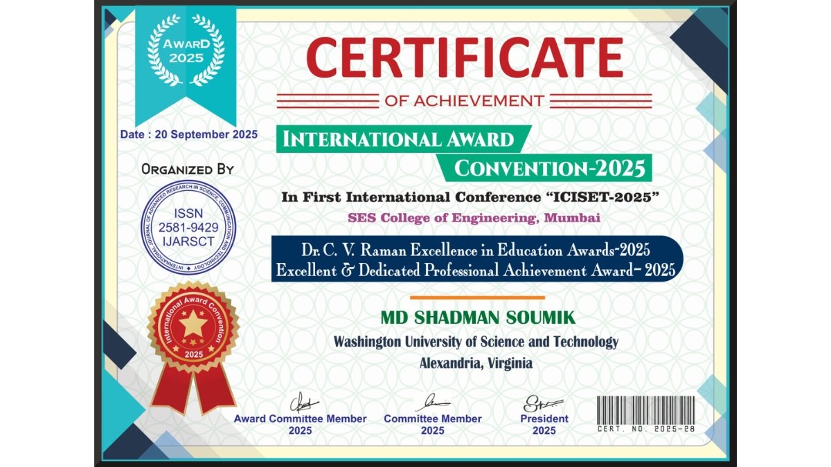 In recognition of his contributions, Soumik received the “Excellent & Dedicated Professional Achievement Award – 2025” under Dr. C. V. Raman Excellence in Education Awards. This accolade highlights his growing influence as a young researcher combining academic rigor with real-world impact.